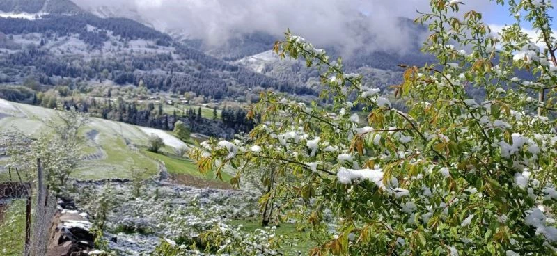 Doğu Karadeniz Bölgesi’nin yüksek kesimlerinde Mayıs ayında kar yağışı etkili oldu. Artvin’in Şavşat ilçesinde bulunan Yavuzköy köyünde görülen yağışın ardından ağaçlarının üzeri karla kaplandı. İlkbaharla birlikte yeşillenen bölge beyaza bürünürken kartpostallık görüntüler sundu.