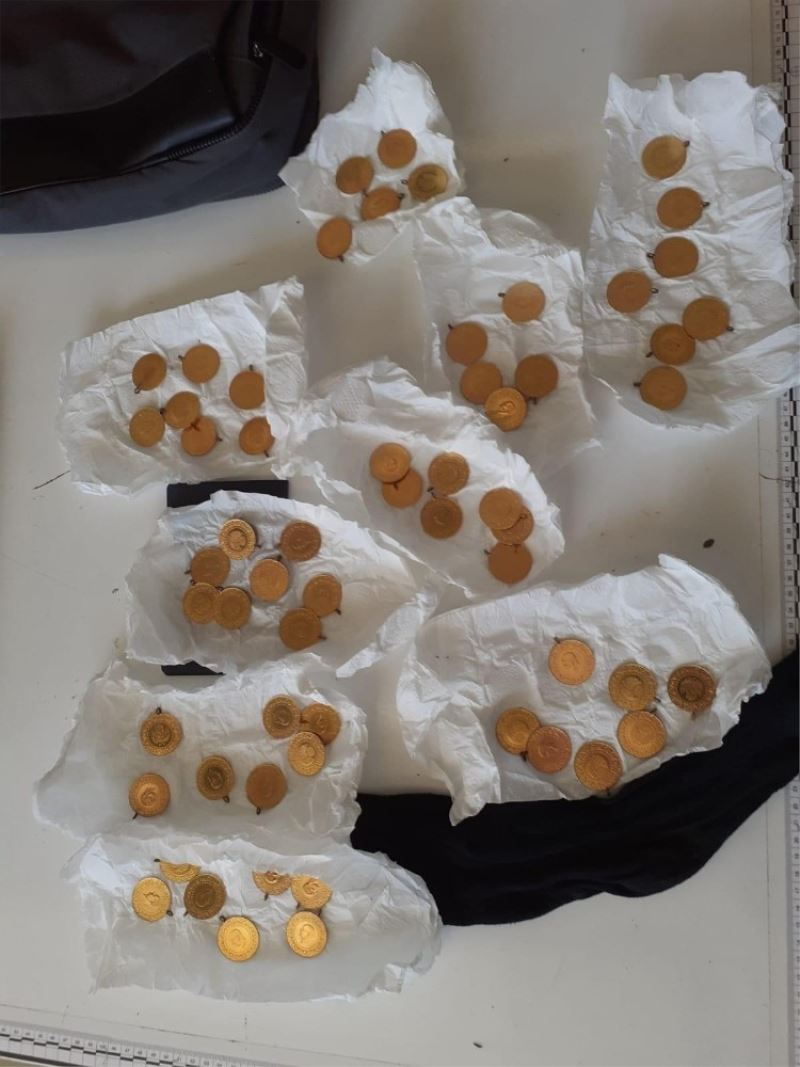 Laboratuvar kısmında görevli Polis memuru Serbülent B. ise altınların laptop çantasının içerisinde bulunan astara sıkıştığını fark ederek altınları bulmayı başardı.
