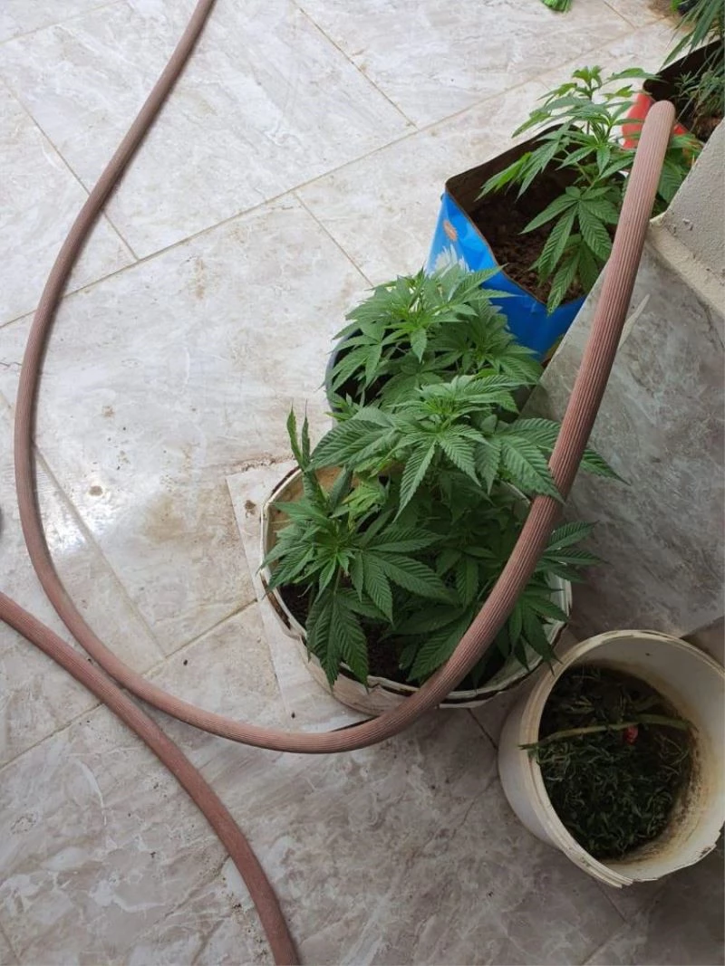 Adrese operasyon düzenleyen ekipler, yaptiklari aramada evin balkonundaki saksilarda, boylari 5 ila 50 santimetreye ulasan Hint keneviriyle karsilasti.