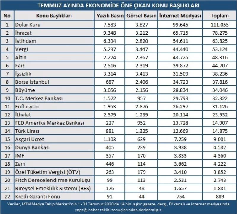 Medya Takip Merkezi (MTM), temmuz ayında öne çıkan ekonomi başlıklarını belirledi. Rapora göre, ekonomi gündemini en çok dolar ve altın kurundaki yükselişler meşgul ederken, ihracat rakamları da gündemde yer alan diğer bir başlık oldu.