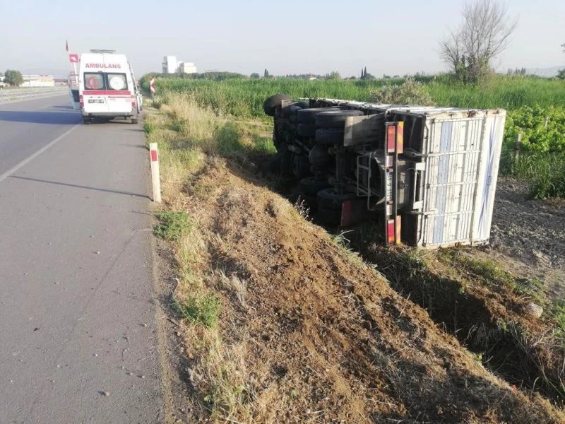 Manisa’nın Salihli ilçesinde sürücüsünün direksiyon hakimiyetini kaybettiği kamyon, yol kenarındaki tarlaya devrildi. Kazada sürücü yaralandı.