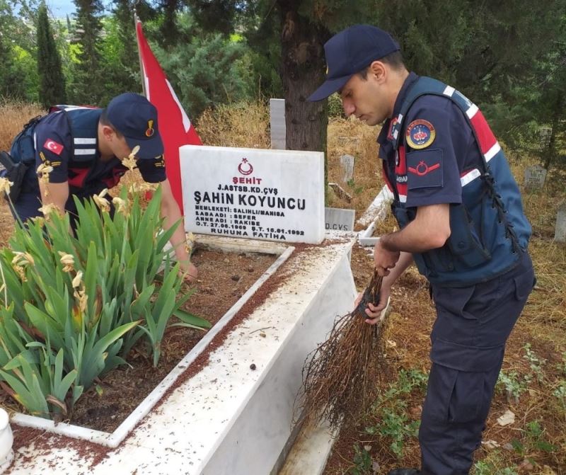 Manisa’nın Salihli ilçesinde bulunan bütün şehit mezarlarının bakım ve temizliği jandarma ekipleri tarafından yapılırken, eskiyen bayraklar ise yenileriyle değiştirildi.