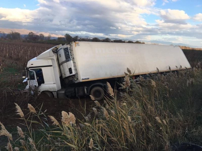 Manisa’nın Salihli ilçesinde yağan yağmurla birlikte kayganlaşan yolda sürücüsünün kontrolünden çıkan tır üzüm bağına girdi. Tır sürücüsü kazayı hafif sıyrıklarla atlattı.