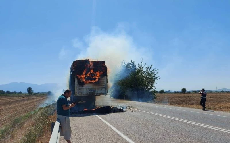 Osmaniye’de seyir halindeki saman balyası yüklü tır alev alev yandı.