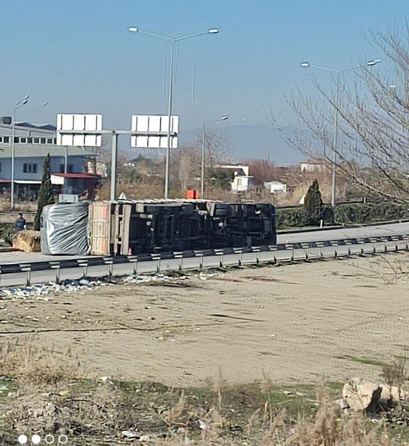 Denizli’de virajı alamayan saman balyası yüklü tır, sürücüsünün kontörlünden çıkarak devrildi. Yoldan kaldırılan balyalar başka bir tırla götürülürken, sürücü kazayı yara almadan atlattı.