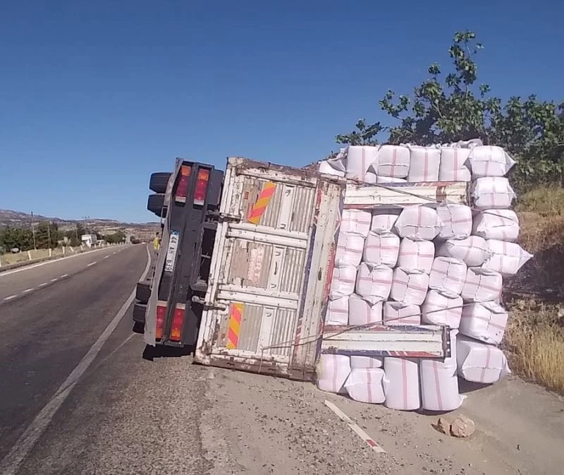 Adıyaman’da, sürücüsünün direksiyon hakimiyetini kaybettiği saman yüklü kamyon devrildi.