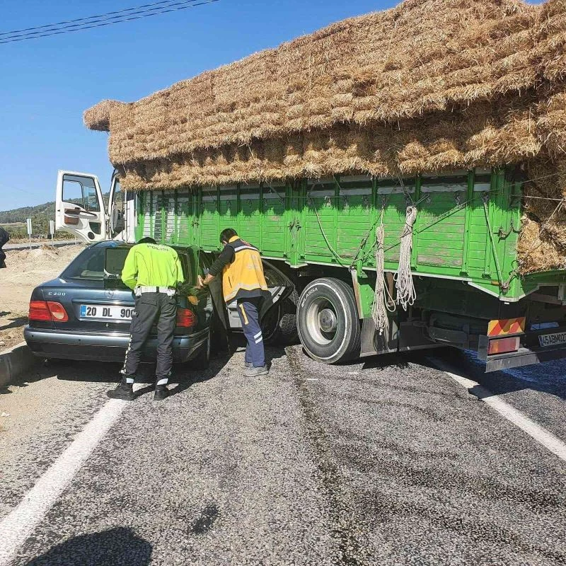Manisa’nın Sarıgöl ilçesinde saman yüklü bir kamyona çarpan otomobilde bulunan biri çocuk 4 kişi yaralandı.