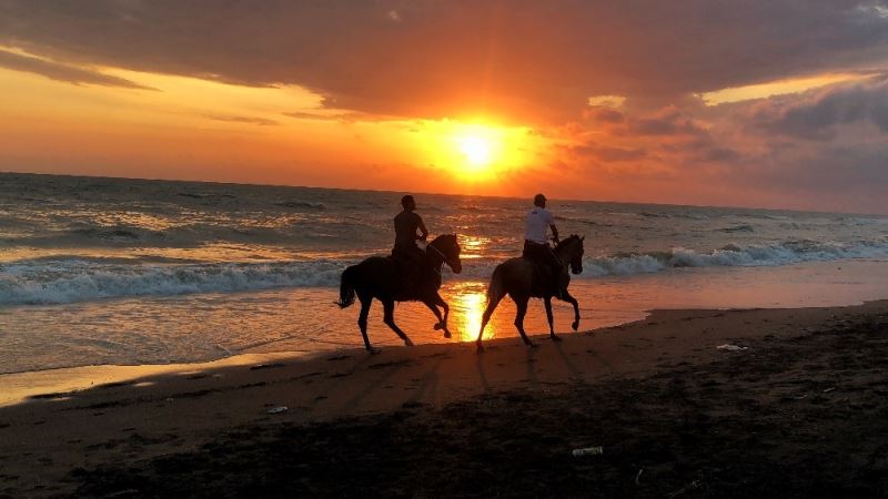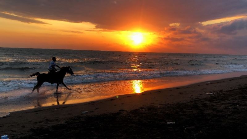 Hatay’ın Samandağ ilçesi sahilinde gün batımı manzarası görenleri mest etti.