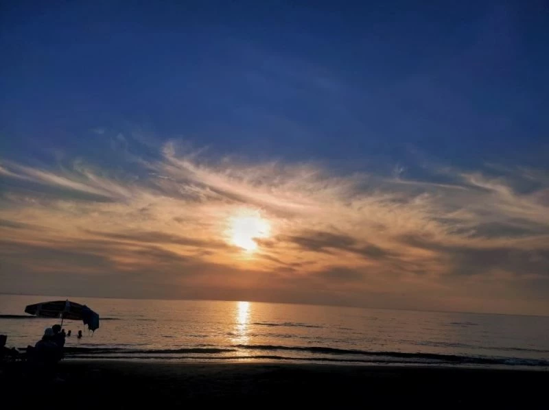 Samandağ sahilinde gün batımıyla birlikte gökyüzü kızıla büründü. Bulutların arasından yansıyan güneş ışınları görsel bir şölen oluştururken, gün batımıyla teknelerin birleşimi kartpostallık görüntüler ortaya çıktı.