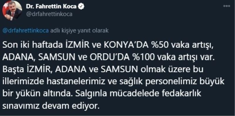 Sağlık Bakanı Fahrettin Koca sosyal medya hesabından yaptığı açıklamada şu ifadelere yer verdi: “Adana, Samsun ve Ordu’da yüzde 100 vaka artışı var. Başta İzmir, Adana ve Samsun olmak üzere bu illerimizde hastanelerimiz ve sağlık personelimiz büyük bir yükün altında. Salgınla mücadelede fedakârlık sınavımız devam ediyor.”
