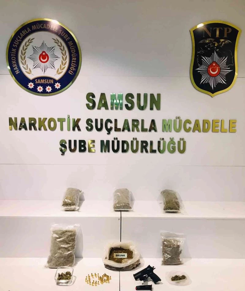 Edinilen bilgiye göre, Samsun Emniyet Müdürlüğü Narkotik Suçlarla Mücadele Şube Müdürlüğü ekipleri, Samsun Cumhuriyet Başsavcılığı koordinesinde uyuşturucu ile mücadele çerçevesinde yaptığı takip ve çalışmalar doğrultusunda Samsun il merkezinde irtibatlı oldukları şahıslara müşterek hareket ederek uyuşturucu madde satışı yaptıkları ve Canik ilçesi Hasköy Mahallesi’nde bulunan ikametlerinde yüklü miktarda uyuşturucu madde bulundurdukları istihbar edilen U.Ö. ve E.K. isimli şahıslara ait adrese operasyon düzenledi. Yapılan aramada, 8 paket halinde toplam 2 kilo 589 gram skunk maddesi, 1 adet 9 mm çapında ruhsatsız tabanca ve 42 adet 9 mm çapında tabanca fişeği ele geçirildi. U.Ö. gözaltına alındı. Firarda olan E.K.’nin yakalanmasına çalışılıyor.