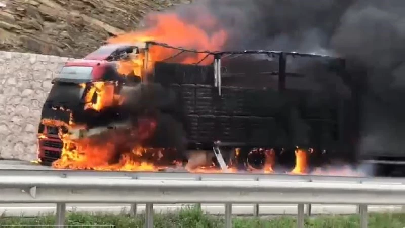 Samsun’da seyir halindeki tırda yüklü 600 bin liralık pamuk çıkan yangında araçla birlikte yandı.