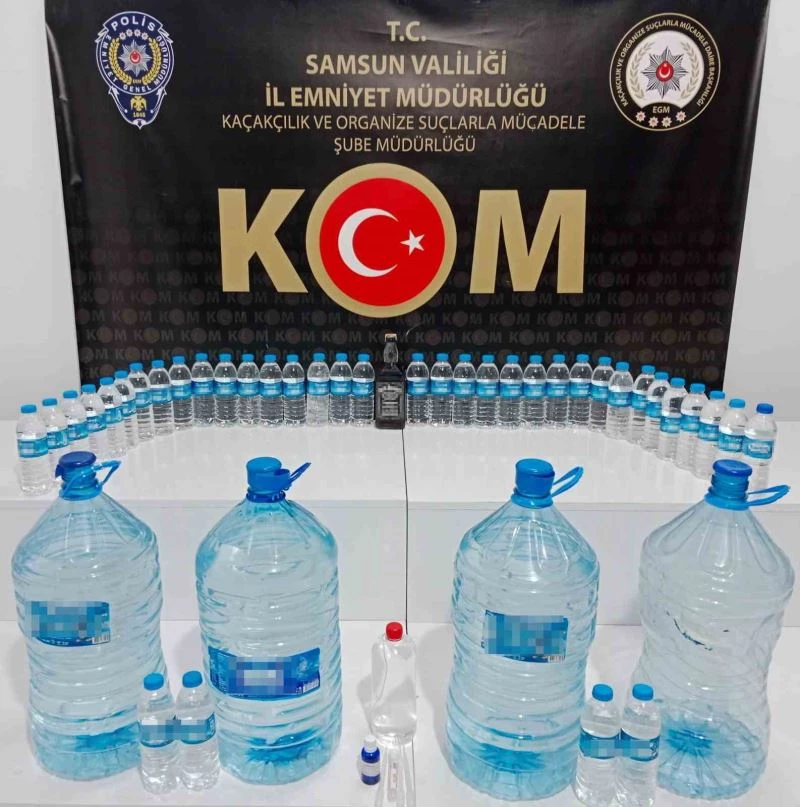 Samsun’da KOM polisi tarafından bir eve yapılan baskında 79,5 litre el yapımı sahte içki ve içki yapımında kullanılan malzemeler ele geçirildi.