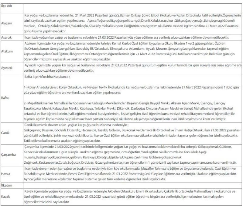 Samsun İl Milli Eğitim Müdürlüğü kar yağışı ve buzlanma nedeniyle yarın eğitim öğretime ara verilecek okulları duyurdu. Asarcık, Ayvacık, Ladik ilçelerinde tüm okulların yarın yüz yüze eğitime ara vereceği belirtilen açıklamada İlkadım ilçesi hariç diğer 13 ilçede de çeşitli okullara kar tatili verildi.