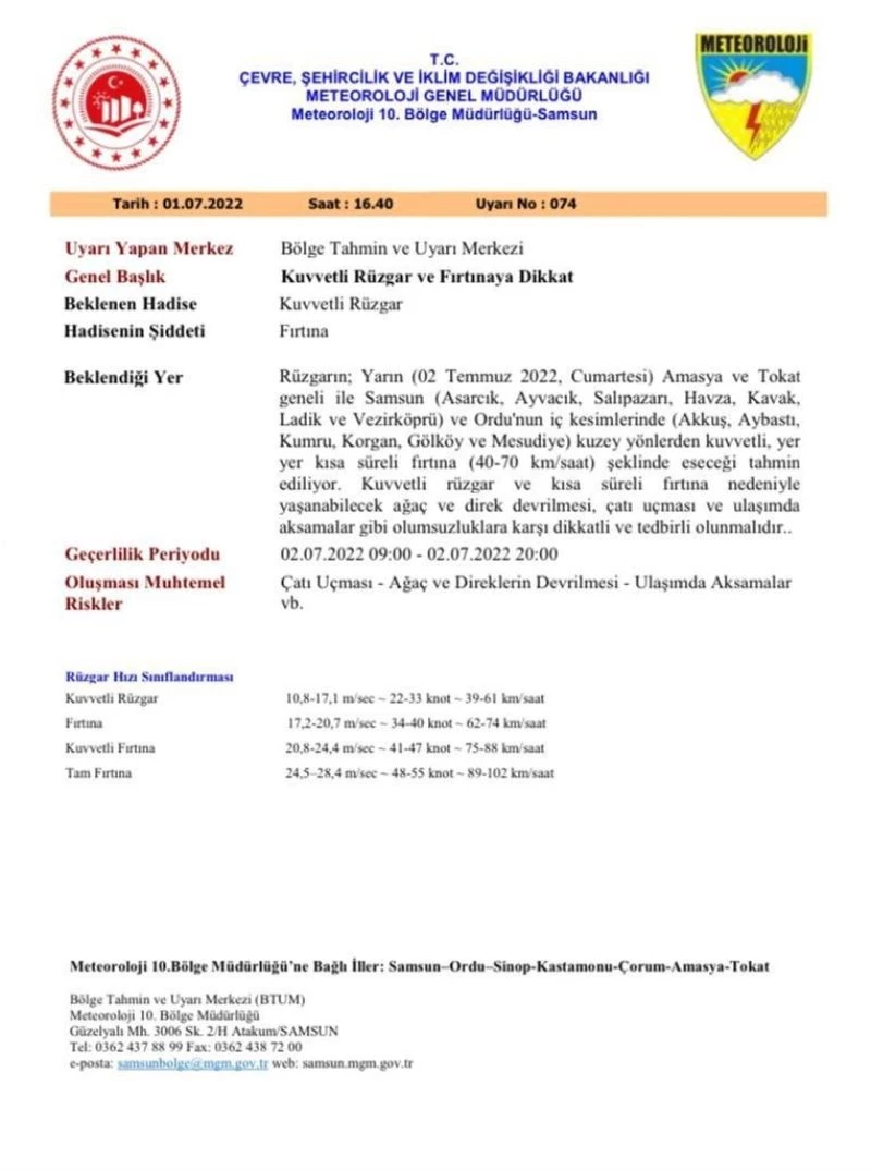 Meteoroloji 10. Bölge Müdürlüğü’nden Samsun’un iç kesimlerinde yer yer kuvvetli rüzgar ve fırtına uyarısı yapıldı. 2 Temmuz Cumartesi günü saat 09.00 ve 20.00 aralığında yaşanacak olumsuzluklara karşı dikkatli olunması vurgulandı.