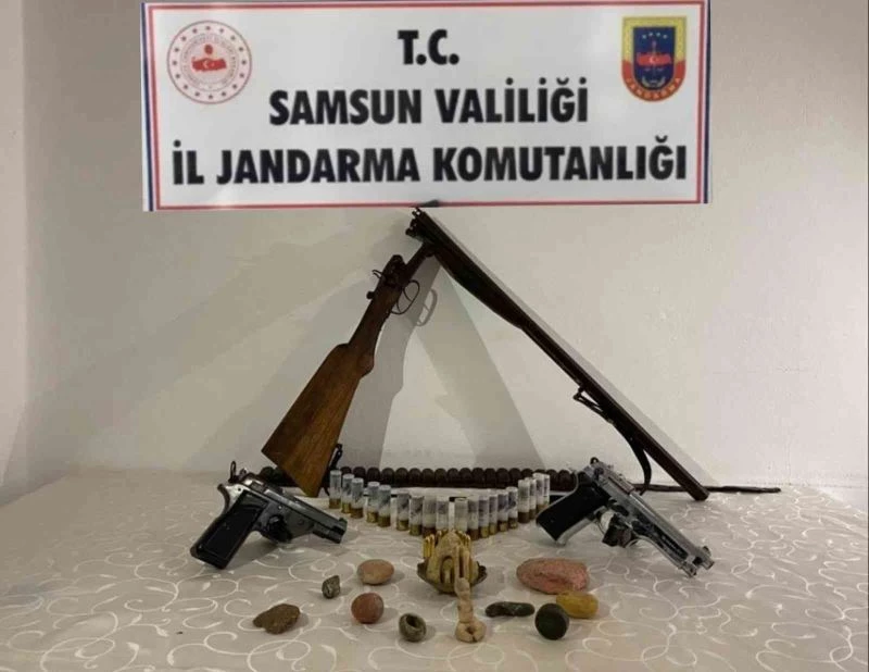 Edinilen bilgiye göre; Samsun İl Jandarma Komutanlığına bağlı Salıpazarı İlçe Jandarma Komutanlığı ekiplerince gerçekleştirilen operasyonda, Salıpazarı ilçesi Kırgıl Mahallesi’nde D.K.’nin ikametinde kaçak silah ticareti iddiasıyla gerçekleştirilen aramada, 2 adet ruhsatsız el yapımı tabanca, 1 adet tabanca şarjörü, 19 adet 9X19 mühimmat, ruhsatsız 1 adet av tüfeği, 19 adet dolu av tüfeği kartuşu, 5 parça içerisinde 1 adet sarı renkli kıymetli tarihi niteliği olduğu değerlendirilen küçük heykel, taş vb. maddeler ele geçirildi.