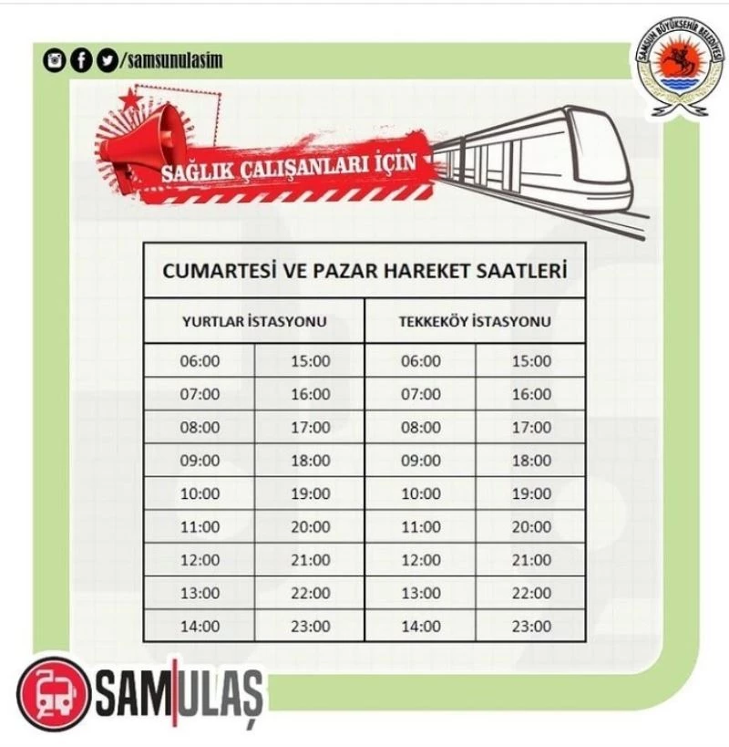 SAMULAŞ sosyal medya hesabından yaptığı açıklamada, “Korona virüs ile ilgili yeni alınan tedbirler kapsamında hafta sonu uygulanacak sokağa çıkma yasağında istisna kapsamındaki vatandaşlarımız için tramvaylarımız ile hizmetinizdeyiz” denildi.