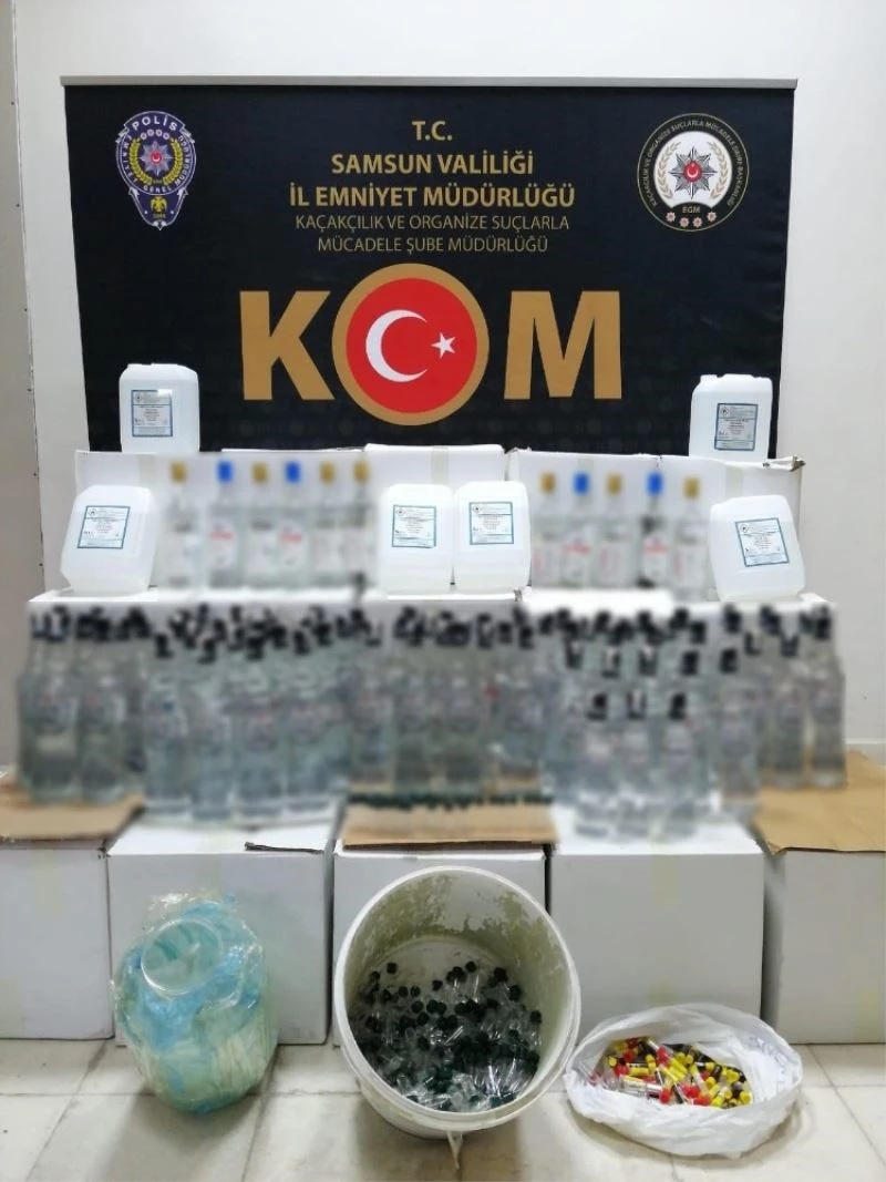 Edinilen bilgiye göre, Samsun Emniyet Müdürlüğü KOM Şube Müdürlüğü ekipleri, kaçakçılık ile mücadele faaliyetleri kapsamında, İlkadım ilçesi Cedit Mahallesi’nde bulunan C.A.’nın ikametine operasyon düzenledi. Evde yapılan aramada, 81 adet cam şişe içerisinde sahte bandrollü olduğu değerlendirilen 100 cc’lik alkollü içki, 32 adet cam şişe içerisinde sahte bandrollü olduğu değerlendirilen 70 cc’lik alkollü içki, 19 adet cam şişe içerisinde sahte bandrollü olduğu değerlendirilen 35 cc’lik alkollü içki, 10 adet cam şişe içerisinde sahte bandrollü olduğu değerlendirilen 50 cc’lik olmak toplamda 142 adet şişelenmiş alkollü içki, 34 adet 5 litrelik plastik bidonlar içerisinde etil alkol, 36 adet 1 litrelik cam şişe içerisinde etil alkol, 240 adet 1 litrelik cam şişe içerisinde etil alkol, 593 adet değişik marka ve ebatlarda cam ve plastik şişe içerisinde sahte alkol yapımında kullanıldığı değerlendirilen anason ele geçirildi. Olayda ilgili gözaltına alınan C.A. hakkında 5607 sayılı yasaya muhalefetten yasal işlem başlatıldı.