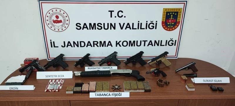 Edinilen bilgiye göre, Samsun İl Jandarma Komutanlığı Kaçakçılık ve Organize Suçlarla Mücadele (KOM) Şube Müdürlüğü, İstihbarat Şube Müdürlüğü, JASAT, Atakum İlçe Jandarma Komutanlığı ve Tekkeköy Jandarma Komutanlığı ekipleri, kaçakçılıkla mücadele çerçevesinde yaptıkları takip ve çalışma istikametinde yürütülen çalışma neticesinde A.G. isimli şahsa yönelik operasyon yaptı. A.G.’nin silah ticareti ve uyuşturucu ticareti yaptığı bilgisi üzerine Atakum ilçesi Kolpınar Mahallesi ile Tekkeköy ilçesi 19 Mayıs Mahallesi’nde iki ayrı adrese eş zamanlı yapılan operasyonda 1 adet iki fişek kapasiteli anahtarlık görünümlü suikast tabancası, 7 adet ruhsatsız 9 mm tabanca,1 adet ruhsatsız 7,65 tabanca, 1 adet ruhsatsız pompalı tüfek, 440 adet 9 mm çapında tabanca fişeği, 45 adet 7,65 mm çapında tabanca fişeği, 12 adet 9,65 mm çapında tabanca fişeği, 7 gram eroin olduğu değerlendirilen madde ve 32 adet sentetik ecza hap ele geçirildi. Olayla ilgili gözaltına alınan A.G. Atakum İlçe Jandarma Komutanlığı ekiplerine teslim edildi. Soruşturma devam ediyor.