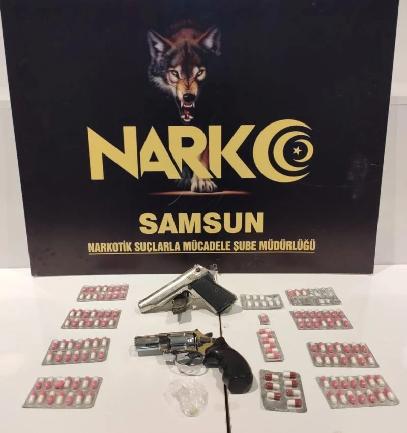Olay, Samsun’un Atakum ilçesi Denizevleri Mahallesi’nde meydana geldi. Edinilen bilgiye göre, Samsun Emniyet Müdürlüğü Narkotik Suçlarla Mücadele Şube Müdürlüğü ekipleri, bir kullanıcı şahıstan 42 adet sentetik ecza ele geçirdi. Olayın devamında K.Y.(46) gözaltına alındı. K.Y.’nin ikametinde yapılan aramada 85 adet sentetik ecza, 1 adet ecstasy hap ve 2 adet kurusıkı tabanca elde edildi. Olayla ilgili U.S.A.(19) da gözaltına alındı. Narkotik Şube Müdürlüğünde işlemleri tamamlanan K.Y. ve U.S.A., "uyuşturucu ticareti yapmak" suçundan bugün Samsun Adliyesine sevk edildi. Nöbetçi mahkemeye ifade veren K.Y. ve U.S.A. adli kontrol şartıyla serbest bırakıldı.