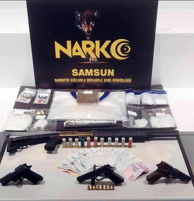 Edinilen bilgiye göre, Samsun Emniyet Müdürlüğü Narkotik Suçlarla Mücadele Şube Müdürlüğü ekipleri Atakum ilçesi Körfez Mahallesi’nde uyuşturucu madde satışı yaptığı bilgisi üzerine M.B.’yi takibe aldı. Gözaltına alınan M.B. ile birlikte 41,40 gram metamfetamin maddesi ele geçirildi. Şüpheli şahsın adresinde yapılan aramada, 997,55 gram metamfetamin maddesi, 11 kapsül sentetik ecza, 0,48 gram esrar maddesi, 1 adet hassas terazi, 2 adet 9 mm çapında ruhsatsız tabanca, 1 adet 7,65 mm çapında ruhsatsız tabanca, 1 adet pompalı tüfek, 9 adet 9 mm çapında tabanca fişeği, 2 adet 7,65 mm çapında tabanca fişeği, 3 adet şarjör, 11 adet tüfek kartuşu ve 4 adet uyuşturucu içme aparatı ele geçirildi.