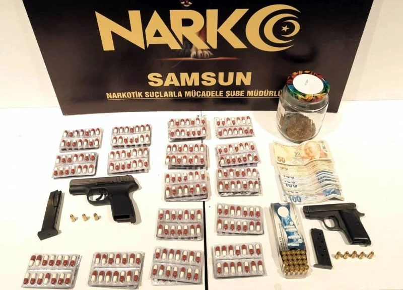 Olay, Samsun’un İlkadım ilçesi Adalet Mahallesi’nde meydana geldi. Edinilen bilgiye göre, Samsun Emniyet Müdürlüğü Narkotik Suçlarla Mücadele Şube Müdürlüğü ekipleri, irtibatlı olduğu şahıslara uyuşturucu madde satışı yaptığı belirlenen A.C.K. isimli şahsı takibe aldı. Narkotik ekiplerinin yaptıkları takip ve çalışmalarda, şüpheli ile temasta bulunan S.T. isimli şahıstan 112 kapsül sentetik ecza, 1 adet 7,65 mm çapında ruhsatsız tabanca ve 3 adet 7,65 mm çapında tabanca fişeği ele geçirildi. A.C.K.’nin ikametinde yapılan aramada da 389 kapsül sentetik ecza, 4,46 gram esrar maddesi, 1 adet 7,65 mm çapında ruhsatsız tabanca, 5 adet 7,65 mm çapında tabanca fişeği, 20 adet 9 mm çapında tabanca fişeği ve uyuşturucu madde satışından elde edildiği değerlendirilen 3 bin 745 TL elde edildi. Gözaltına alınan A.C.K. ile uyuşturucu madde ticaretine aracılık yaptığı tespit edilen S.T., bugün Samsun Adliyesi’ne sevk edildi.