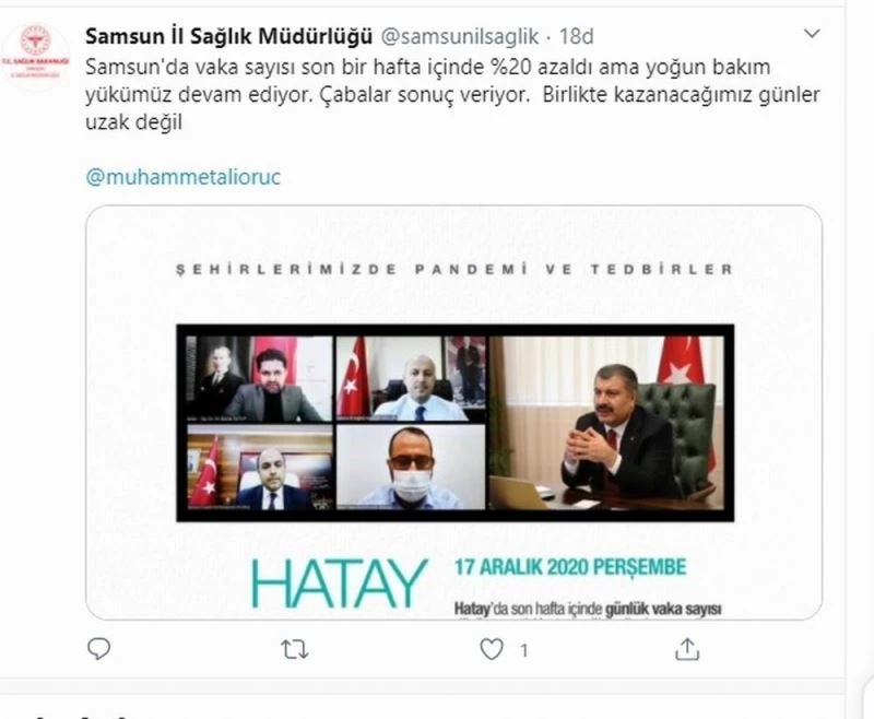 “Samsun’da vaka sayısı son bir hafta içinde yüzde 20 azaldı ama yoğun bakım yükümüz devam ediyor. Çabalar sonuç veriyor. Birlikte kazanacağımız günler uzak değil.”