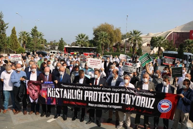 Memur-Sen öncülüğünde toplanan Samsun’un ileri gelen idarecileri ve vatandaşlar, Büyük Cami’de kılınan öğle namazının ardından fiziksel mesafe kuralına uyarak basın açıklaması yaptı. Türkçe, Fransızca ve İngilizce dövizlerin bulunduğu basın açıklamasında, “İnsanların inançlarını hedef almak özgürlük değil, küstahlıktır” yazılı pankart açıldı. Pankartta ‘Nazi’ bıyıklı Macron’un fotoğrafına yer verilirken, fotoğrafın üstündeki bot izi ise dikkat çekti. Açıklamada ayrıca Türk mallarına boykot uygulayan ve Fransa’yı destekleyen Suudi Arabistan ve Birleşik Arap Emirlikleri’ne(BAE) de tepki gösterildi.