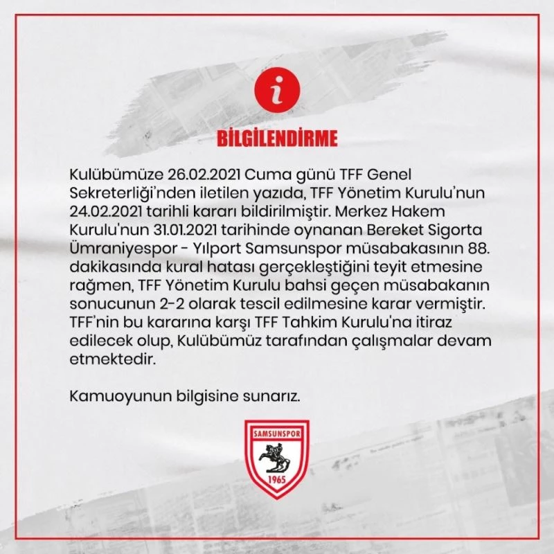 “Kulübümüze 26 Şubat Cuma günü TFF Genel Sekreterliği’nden iletilen yazıda, TFF Yönetim Kurulu’nun 24 Şubat tarihli kararı bildirilmiştir. MHK’nın 31 Ocak tarihinde oynanan Bereket Sigorta Ümraniyespor-Yılport Samsunspor müsabakasının 88. dakikasında kural hatası gerçekleştiğini teyit etmesine rağmen, TFF Yönetim Kurulu bahsi geçen müsabakanın sonucunun 2-2 olarak tescil edilmesine karar vermiştir. TFF’nin bu kararına karşı TFF Tahkim Kurulu’na itiraz edilecek olup, kulübümüz tarafından çalışmalar devam etmektedir. Kamuoyunun bilgisine sunarız.”