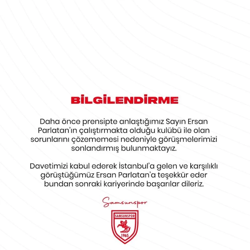 Samsunspor’dan bugün yapılan yazılı açıklamada, Ersan Parlatan ile de görüşmelerin olumsuz sonlandığı belirtildi. Açıklamada, “Daha önce prensipte anlaştığımız Ersan Parlatan’ın çalışmakta olduğu kulübü ile olan sorunlarını çözememesi nedeniyle görüşmelerimizi sonlandırmış bulunmaktayız. Davetimizi kabul ederek İstanbul’a kadar gelen ve karşılıklı görüştüğümüz Ersan Parlatan’a teşekkür eder, bundan sonraki kariyerinde başarılar dileriz” denildi.