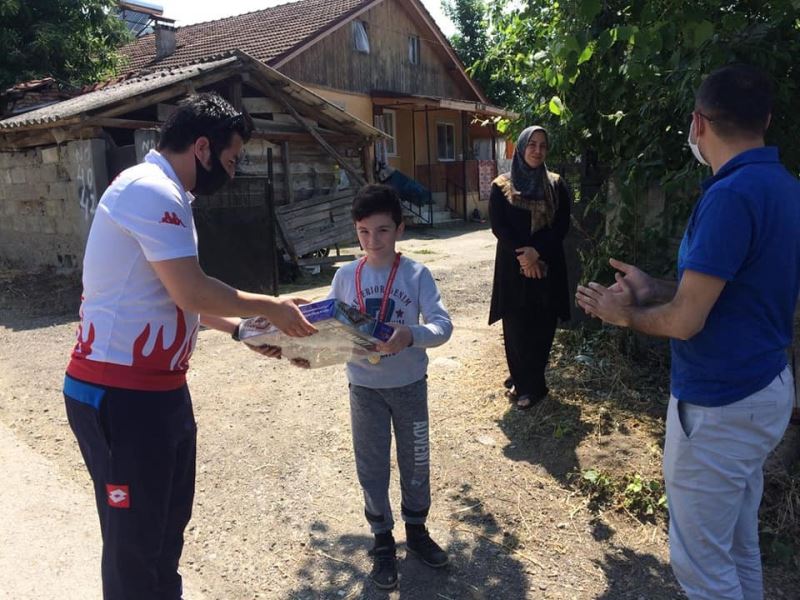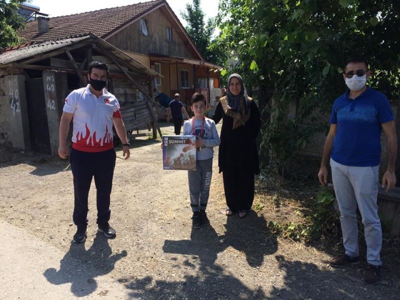 DÜZCE(İHA) – Korona virüs nedeni ile Gençlik Haftasında sanal ortamda düzenlenen yarışmalarda derece elde edenlere Kaynaşlı Belediye Başkanı Birol Şahin ödüllerini gençlerin ve çocukların evlerine giderek bizzat teslim etti.