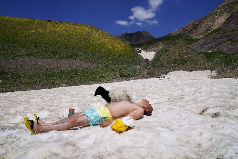 Ünlü türkücü Aydın Aydın, Hakkari’nin 3200 rakımlı Cilo-Sat Dağları’nda ’Canocan’ adını verdiği kuzusuyla birlikte kar ve çamur banyosu yaptıktan sonra buz gibi gölde yüzdü.
