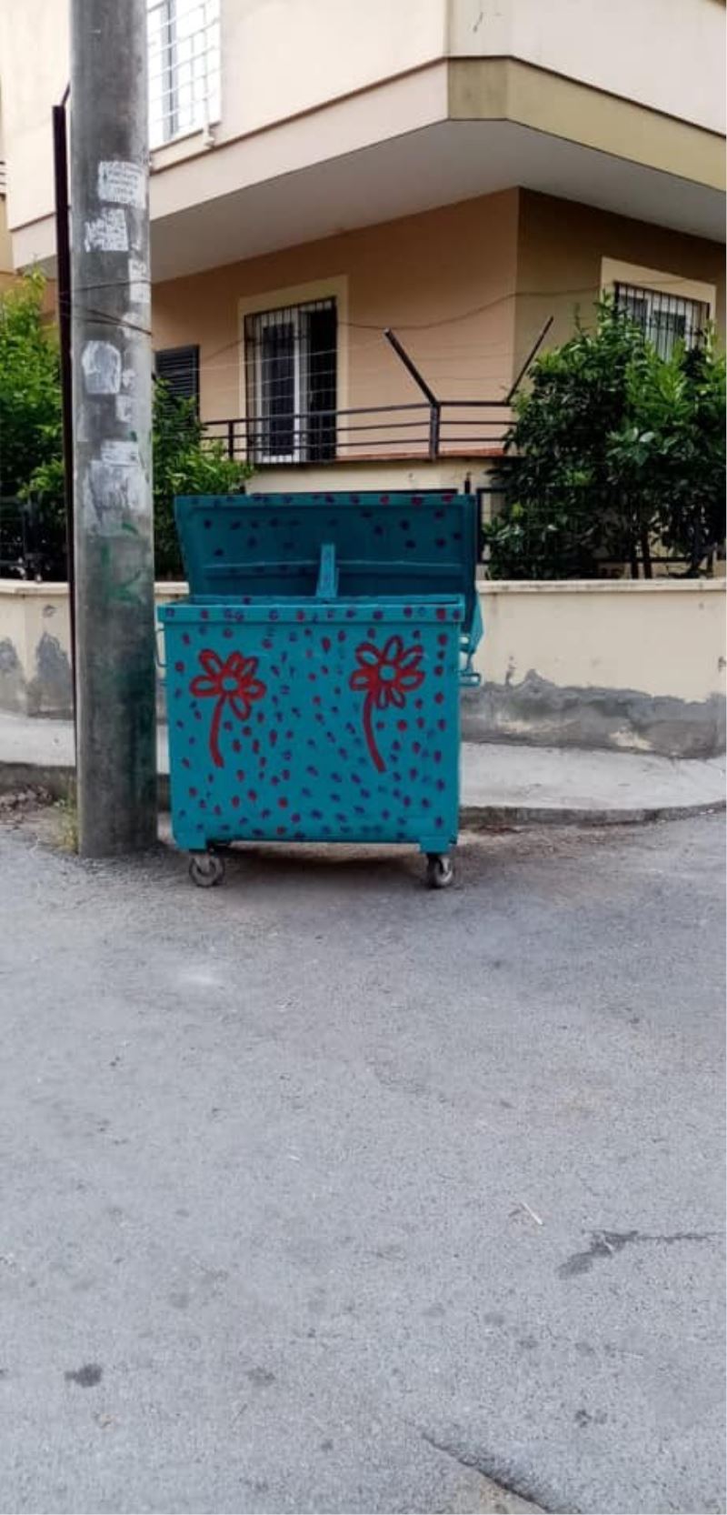 Gaziler Mahallemizde ikamet eden Tarsus Belediyesi Temizlik İşleri Müdürlüğü’nde çalışan Ali Gültekin, sokağında bulunan 3 adet çöp konteynerini boyayıp desen yapıp çiçek çizdi.