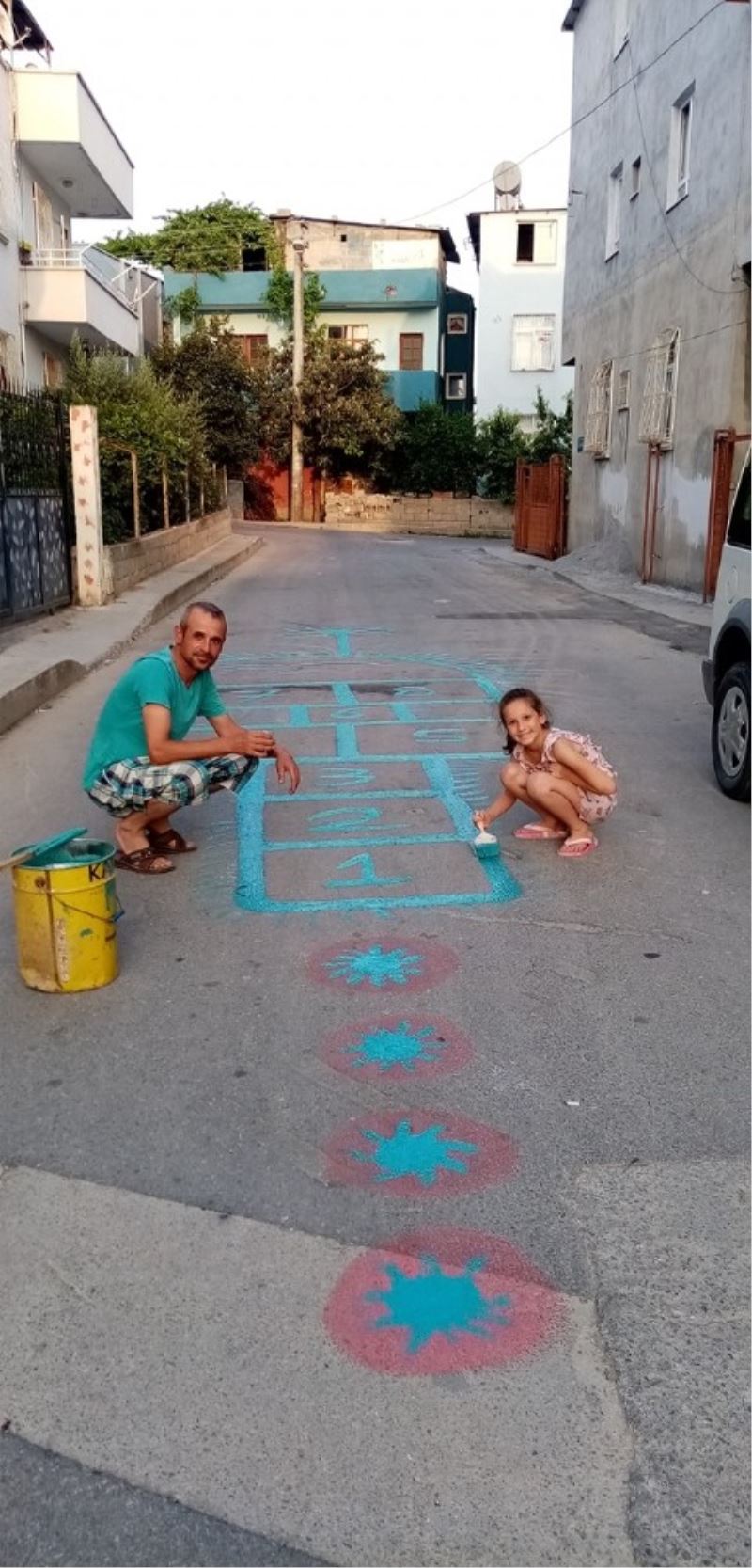Boş zamanında çöp konteynerlerine resim çizdiğini belirten Ali Gültekin, bazen sokaklara oyun çizgileri çizerek çocukların oyun oynamasını sağladığını söyledi.