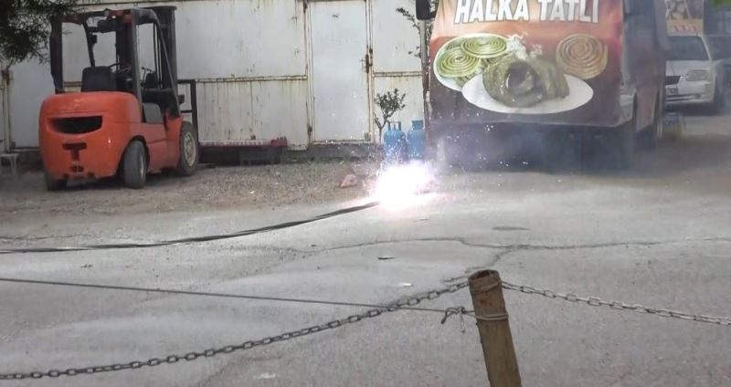 Adıyaman Küçük Sanayi Sitesinde bulunan bir işletmede kaynak yapımı esnasında çıkan yangın sanayi esnafını korkuttu. Yangında alev alarak sokak ortasına düşen elektrik kablosu patlayarak ilerledi.