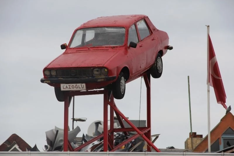 Karadenizli kaporta ustası işlerini artırmak için ’arabayı uçurdu’, çatıdaki araç ilgi odağı oldu.