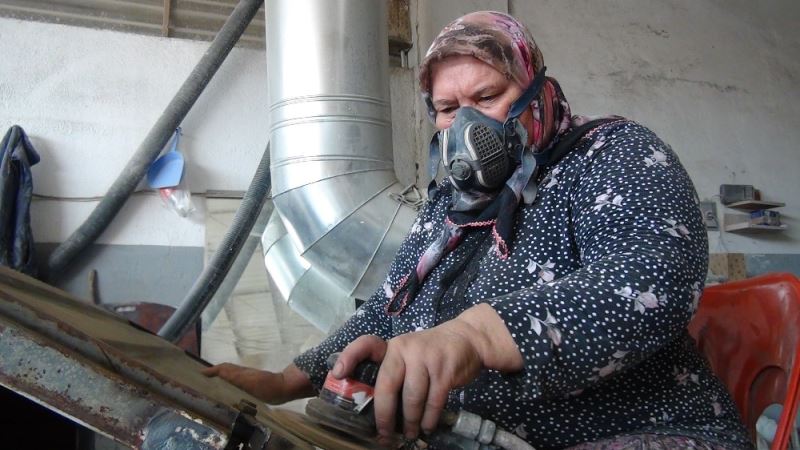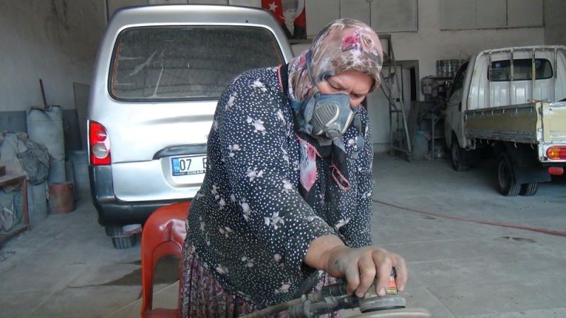 Serik ilçesinde yaşayan Meryem Yılmaz (54), sanayide oto boyacı dükkanı olan eşine, ‘bu işi ben de yapabilirim’ diyerek talepte bulundu. Yaklaşık 7 yıldır otomobil kaportalarını spiral makinesiyle zımparalayan, boyamaya hazır hale getiren Yılmaz, eşi ve oğluyla birlikte mesai yapıyor. Yılmaz’ı dükkanda görenler ise şaşkınlıklarını gizleyemeyip, hatıra fotoğrafı çektiriyor.