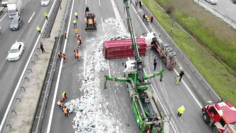 Sancaktepe TEM otoyolunda dorsesi sac ve metal yüklü tır seyir halindeyken devrildi. Sac ve metallerin yola saçılmasıyla yoldaki trafik akışı durdu. Yan yatan tır sürücüsü yaralı halde kurtarılarak sağlık ekiplerince hastaneye kaldırıldı. Kaza nedeniyle TEM otoyolu Ankara istikameti trafiğe kapandı. Yan yatan tır ve yola saçılan sac ve metal parçaları havadan görüntülendi.