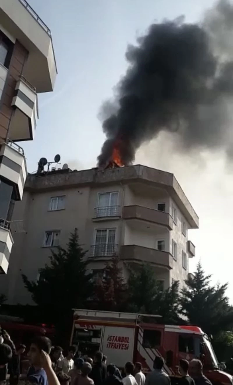 Sancaktepe’de 5 katlı binanın çatısı alev alev yandı