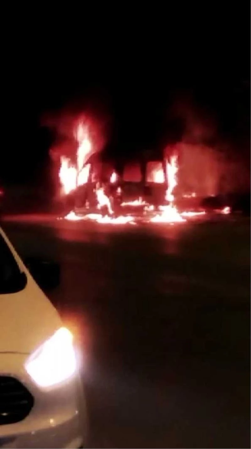 Hem minibüsten hem de ağaçtan yükselen alevler bir vatandaşın cep telefonu kamerasına saniye saniye yansıdı.