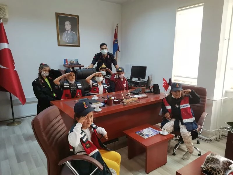 Jandarma bahçesini ve kurum binasını gezen minik öğrenciler asker yeleği giyip asker selamı vererek hatıra fotoğrafı çektirdi.
