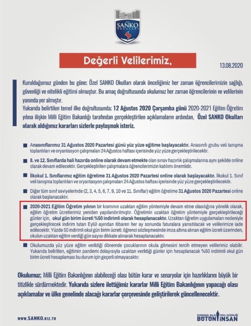 SANKO Okulları’ndan velilere gönderilen duyuruda, 2020- 2021 eğitim öğretim yılında öğretimin uzaktan öğretim yöntemiyle devam ettiği günler için okul gün birim ücretinin yüzde 50 indirimli hesaplanacağını bildirdi.