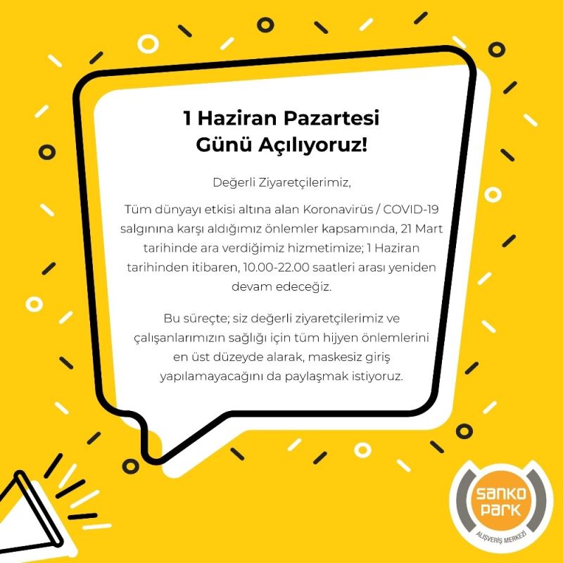 Dünyayı etkisi altına alan Korona virüs (COVID-19) salgını risklerine karşı alınan önlemler kapsamında 21 Mart tarihinde hizmetine bir süreliğine ara veren Sanko Park Alışveriş Merkezi, İçişleri Bakanlığı’nın yayımladığı genelge koşullarına uygun olarak 1 Haziran tarihinden itibaren 10.00-22.00 saatleri arası yeniden hizmet verecek.