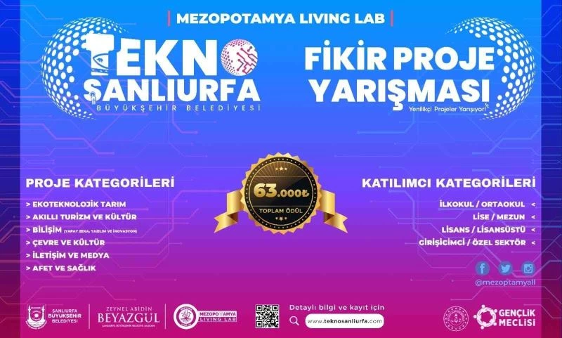 Yenilikçi ve katılımcı bir anlayış ile günümüz teknolojisinden gençlerin faydalanabilmeleri için projeler hazırlayan Şanlıurfa Büyükşehir Belediyesi Mezopotamya Lıvıng Lab, 6 kategoriden oluşan fikir proje yarışması düzenleyecek.