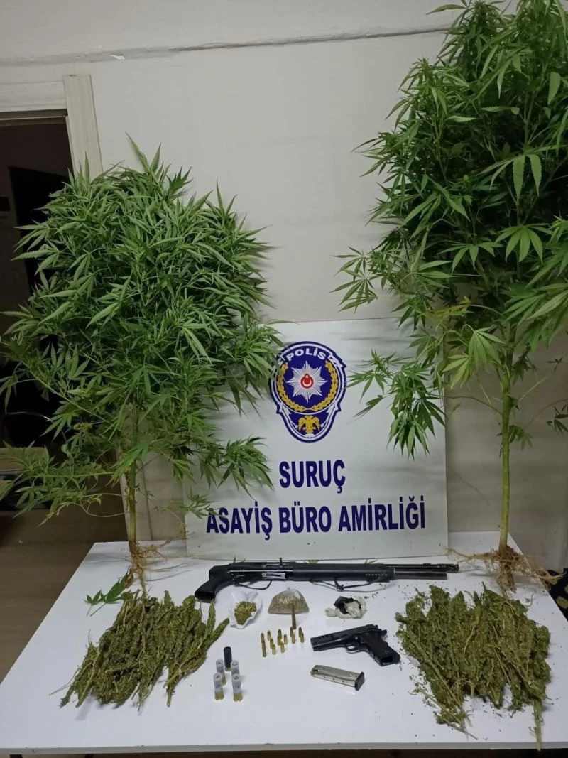 Suruç İlçe Emniyet Müdürlüğü ekiplerince uyuşturucu satışı yapan şahıslara yönelik operasyonda çok miktarda uyuşturucu madde ve silah ele geçirildi.