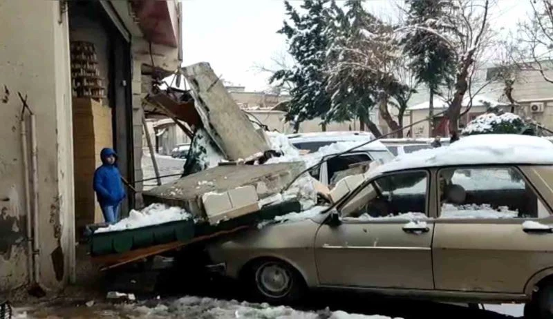 Şanlıurfa’da kar yağışı sonrası çöken tentenin altında kalan araçlar hasar gördü.