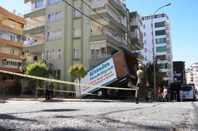 Şanlıurfa’da park halindeyken freni boşalan nakliye kamyonu, 6 katlı apartmanın duvarına çarptı.