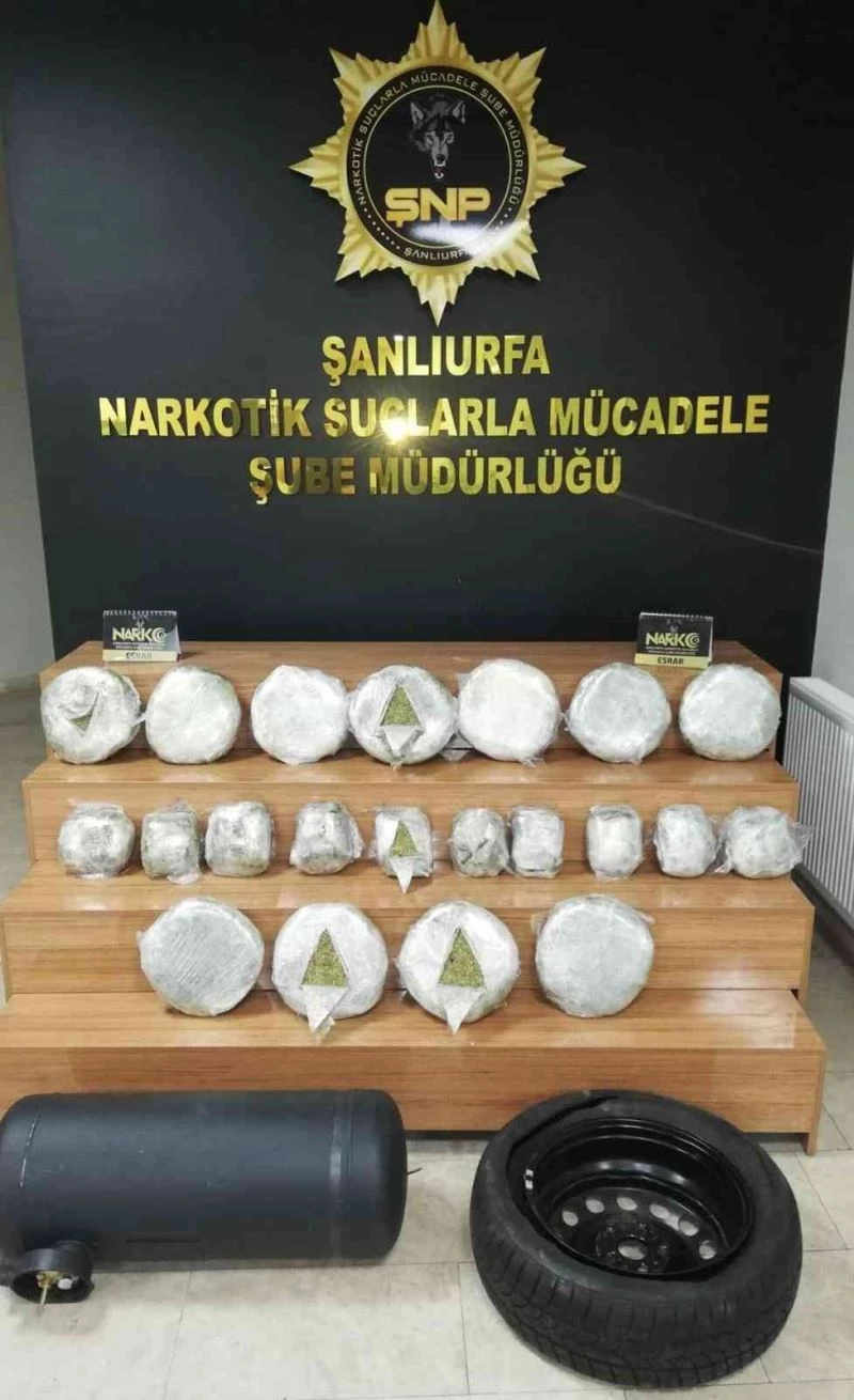 Edinilen bilgiye göre, Şanlıurfa İl Emniyet Müdürlüğü Narkotik Suçlarla Mücadele Şube Müdürlüğü ekipleri, şüphelenerek durdurdukları bir araçta arama yaptı. Yapılan aramada aracın LPG tankı ve araç lastiği içine gizlenmiş 19 kilogram esrar, 800 gram eroin, 30 gram metamfetamin ile 2 adet hassas terazi, 1 adet kurusıkı tabanca ve 1 adet ruhsatsız tabanca ele geçirildi.