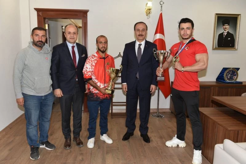 Şanlıurfalı vücut geliştirme sporcusu dünya ikincisi Abdulsamet Çevik ve İstanbul Maratonunda 36 yıllık rekoru kıran Türkiye şampiyonu Hüseyin Can, Vali Abdullah Erin’i ziyaret ederek madalyalarını takdim ettiler.