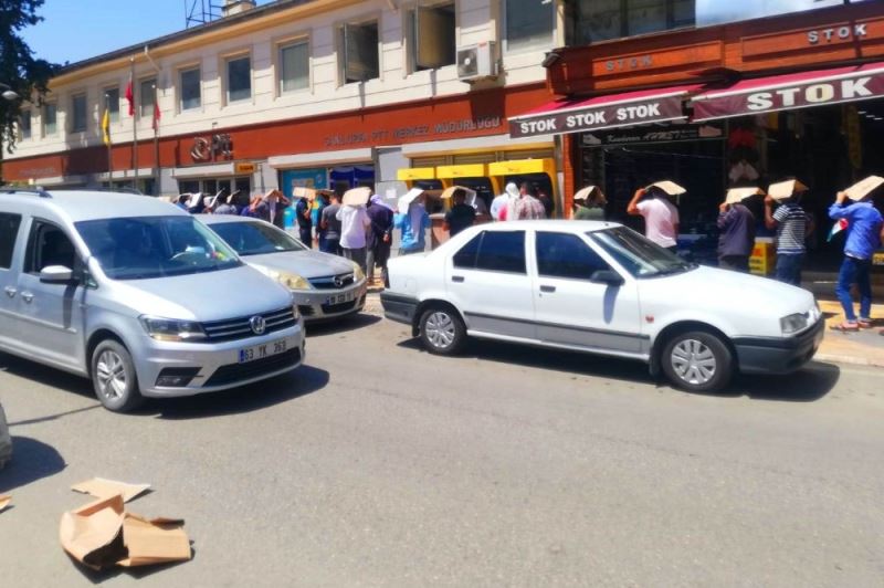 Şanlıurfa’da hava sıcaklığı gün içerisinde 40 derecenin üstüne çıkıyor. Sıcaktan korunmaya çalışan vatandaşlar ise, pratik çözümler üretiyor. Güneşin altında durmak zorunda kalan vatandaşlar, buldukları kartonları kafalarının üstüne koyuyor. Bu şekilde güneşten korunmaya çalışan vatandaşlar, ilgin görüntülerin ortaya çıkmasına neden oluyor. Elektrik faturasını yatırmak için sırada bekleyen bir vatandaş, “Elektrik faturası yatırmaya geldim. Bir saattir bekliyorum, bu kadar sıcağın altında millette bu rezilliği çekiyor. Buna bir çare bulsunlar. Burası her gün böyle. Kafam sıcak oldu, mecbur kartonla bekliyorum. Geçen ay faturayı yatırmadım, bu ayda yatırmasam iki fatura üst üste gelecek, gelip kesiyorlar” şeklinde konuştu.